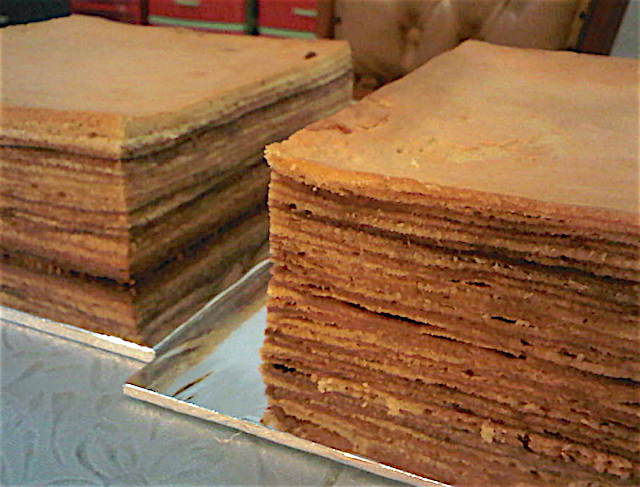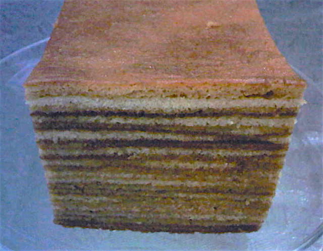 Apakah lapis legit di atas rasanya tidak enak? Hmmm rasanya sih tetap enak, hanya saja lapis legit yang dipanggang terlalu lama sehingga menghasilkan lapisan yang terlalu gelap seperti gambar diatas, akan terasa tegang dan kurang lembut.